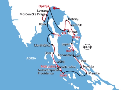 In de Adriatische Zee, tussen Rijeka en Zadar, ligt een honderden kilometers lange strook van grotere en kleinere eilanden: de Kvarner of Dalmatische Eilanden genoemd. De eilanden in de Kvarner baai zijn ware vakantieparadijsjes! Tijdens deze fietsreis kunt u de charme van de eilanden per fiets en per boot ontdekken. Gedurende de dagtochten zal een Duitstalige gids u begeleiden en u de mooiste plekjes op de eilanden laten zien. U fietst gezamenlijk in een groep achter de gids aan zodat u zelf niets hoeft te doen dan te trappen en te genieten van de omgeving. In de nachten ligt het schip in pittoreske haventjes. U bezoekt Krk, Cres, Rab, Pag en Losinj, al jarenlang zeer geliefde vakantiebestemmingen met een overwegend groen en bebost landschap.