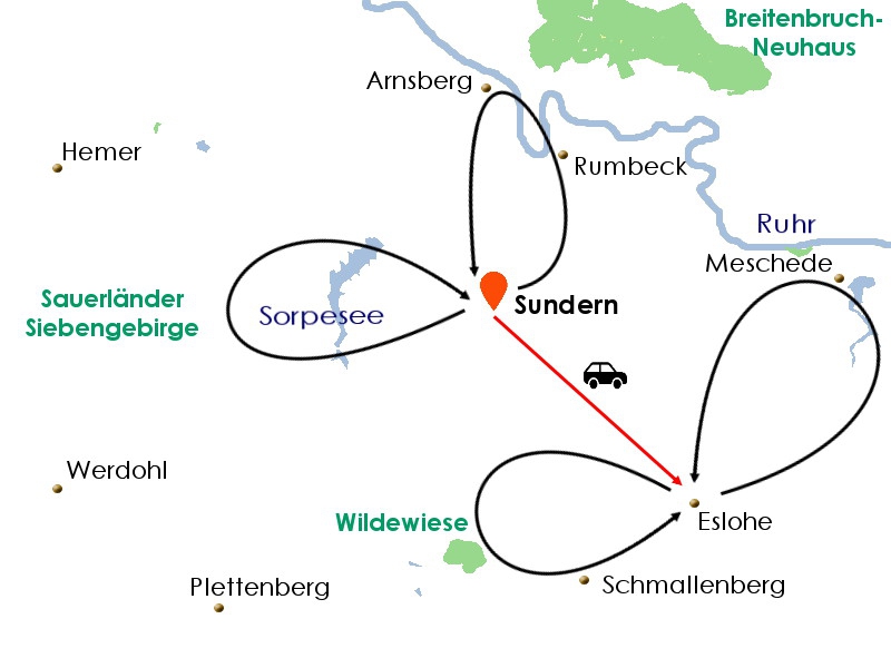 De routes ’Nordschleife’ en ’Sauerland-Radring’ starten in Eslohe, op ca. 20 km vanaf Sundern. Mocht u niet in staat zijn de huurfiets mee te nemen, kunt u in Eslohe nabij het startpunt een extra fiets huren (ter plaatse te regelen en betalen).