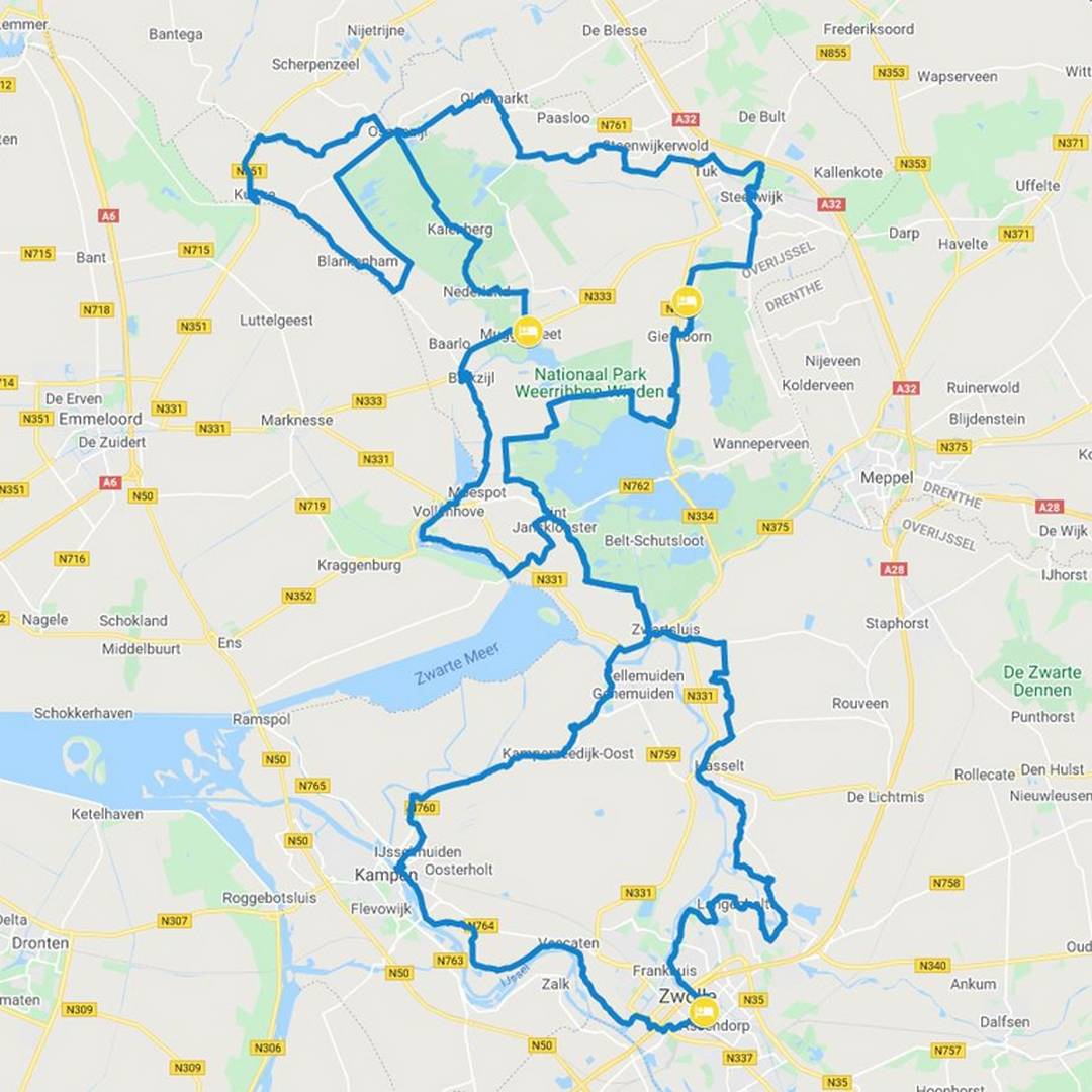 Eerst naar het gezellige Steenwijk, een prima plaats voor een korte koffiestop. Dan door de uitgestrekte landerijen langs plaatsjes als Steenwijkerwold en Oldemarkt naar Ossenzijl. Dit dorp is vanuit het noorden gezien de poort naar de Weerribben-Wieden. Kiest u voor de korte rit dan neemt u hier de LF22 dwars door de Weerribben-Wieden om via Kalenberg naar uw hotel te gaan. Kiest u voor de lange versie dan maakt u eerst een lus langs Slijkenburg en Kuinre weer terug naar Ossenzijl om dan alsnog door de poort naar de Weerribben-Wieden te gaan. De keuze is aan u! Overnachting in Muggenbeet, een klein buurtschap tegen Blokzijl aan.