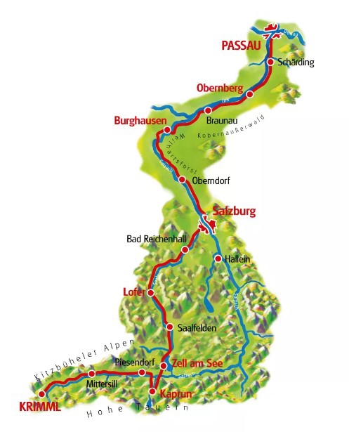 De Tauern Radweg is genoemd naar de Hoge Tauern, een gebergte en tevens een indrukwekkend nationaal park midden in de Alpen in Oostenrijk. De start van deze prachtige route is op 1067 meter hoogte in het bergplaatsje Krimml, waar u de beroemde watervallen kunt bezoeken. In een ontspannen tempo fietst u langs de rivieren de Salzach, de Saalach en de Inn naar Passau, 750 meter lager gelegen dan Krimml. Deze reis voert u langs rivieren, door bossen, akkers en weiden, met de 3000 meter hoge toppen van de Alpen als permanent decor.
