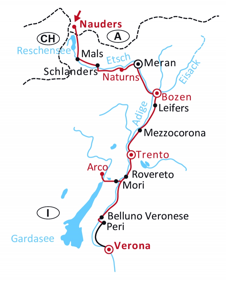 In het noorden van Italië ligt de regio Süd-Tirol. Omdat het tot de Eerste Wereldoorlog tot Oostenrijk behoorde, wordt er Duits gesproken. Alle geografische aanduidingen hebben er daarom twee namen, één in het Italiaans en één in het Duits: Bressanone/Brixen, Bolzano/Bozen, Merano/Meran… maar ook de grootste rivier die er vanuit de hoge Alpen richting de Po-vlakte stroomt: De Adige oftewel de Etsch. De fietstocht van noord naar zuid langs de Adige wordt ook de Etsch Radweg genoemd (Radweg = fietspad).