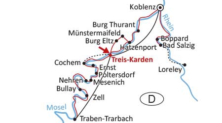 Vanuit Treis-Karden volgt u de Mosel Radweg en komt u langs de schilderachtige plaatsjes Müden, Moselkern en Hatzenport. Via het beekje Schrumpfbach komt u aan bij het stadje Münstermaifeld. Boven het stadje torenen de middeleeuwse verdedigingswerken uit. Het straatbeeld bestaat uit romantische vakwerkhuizen en de restanten van de stadsmuur. Na een bezoek aan Münstermaifeld vervolgt u de fietstocht verder naar Burg Eltz, een van de meest tot de verbeelding sprekende kastelen van Duitsland en dagelijks te bezichtigen. Vanuit hier fietst u via het Eltztal over de Mosel Radweg terug naar uw hotel.
