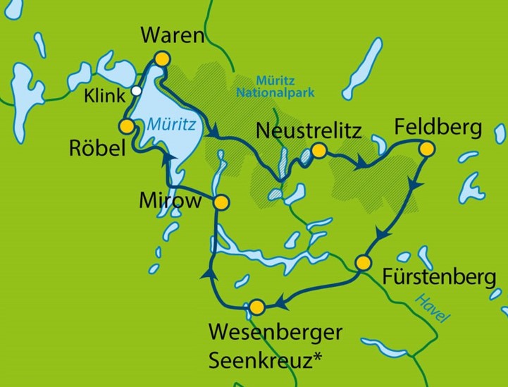 Een mooie route langs de zuidelijke oever van het Müritzmeer via Röbel en Klink naar Waren. Onderweg komt u opnieuw door mooie strandjes, die uitnodigen voor een welverdiende pauze. Van Röbel naar Klink kunt u indien gewenst de route met 10 km verkorten door dat traject per boot te doen (niet inbegrepen).