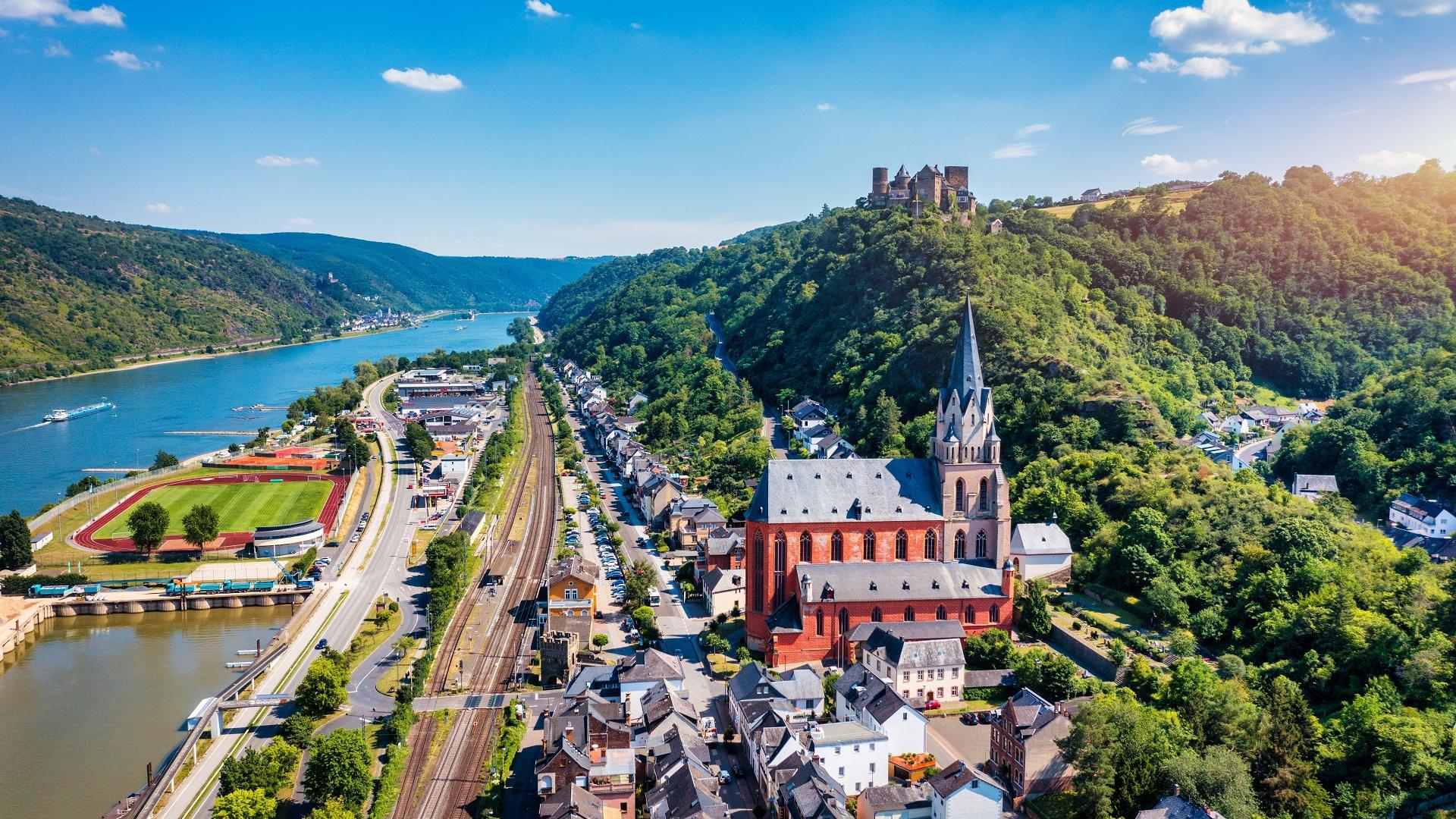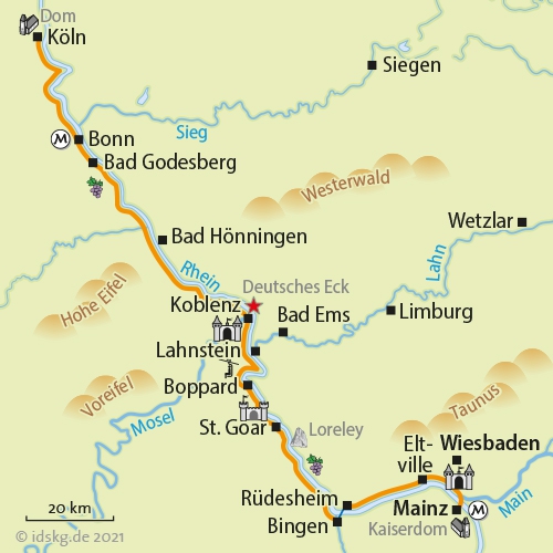Langs de met druiven begroeide hellingen fietst u naar het stadje Eltville met haar vele vakwerkhuizen. U kunt de route verlengen met ca. 14 km om een bezoek te brengen aan klooster Eberbach. De route gaat via het mooie stadje Rüdesheim met haar Drosselgasse. Vanuit Rüdesheim gaat u met het pontje naar Bingen en verder via Bacharach naar Oberwesel, met onderweg vele bezienswaardigheden: de Mäseturm, de burchten Rheinstein en Reichenstein, Sooneck en de ruïne Fürstenberg.