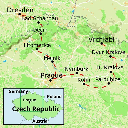 U volgt de rivier westwaarts door het vlakke bekken. De route loopt over veldwegen en verharde wegen langs de rivier. Onderweg is zelfs nog een fietsmuseum te bekijken, dat naast het openluchtmuseum ligt. Aan het einde van de route wacht de Gouden Stad Praag op uw komst. Op de Karelsburg proberen vele musici en kunstenaars een zakcentje te verdienen. Neem zeker ook een kijkje bij de Vituskathedraal, in de Joodse wijk en het Gouden Straatje.
