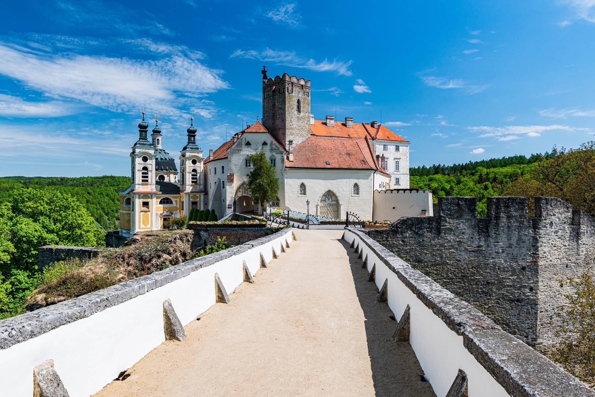 Door het Tsjechisch-Moravische heuvellandschap volgt u een tijdlang een klein stroompje dat in de Thaya uitmondt. U fietst het dichtbeboste dal in, met allerlei imposante burchten op de flanken.