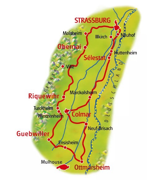 Cultureel hoogtepunt is natuurlijk Straatsburg, een van de mooiste en gezelligste steden van Frankrijk. U vindt veel originele en kleurige vakwerkhuizen in de oude stad, bijvoorbeeld in de wijk La Petit France. Deze huizen werden vroeger beschouwd als roerend goed; bij een verhuizing werd het huis afgebroken en het houten skelet werd in de nieuwe woonplaats weer opnieuw voorzien van takken en leem. Het is interessant om ook de opvallende rode kathedraal en verschillende musea te bezoeken. Ook het kleinere Obernai met zijn mooie marktplaats en gerestaureerde vestingmuren is een aantrekkelijk etappeplaats. Colmar is bekend om haar vele smalle kanaaltjes in de binnenstad en wordt daarom ook 'Petite Venise' (klein Venetië) genoemd. Het 700 jaar oude wijndorp Riquewihr is een van de parels van deze streek. Zo zou een weekje bijna nog te kort zijn…. Met typische gerechten zoals 'Choucroute' en 'Flammenkuchen', de eersteklas wijnen waaronder de Riesling, Sylvaner en Gewürztraminer en het lokaal gebrouwen bier van Kronenbourg komen ook uw smaakpapillen niets te kort.