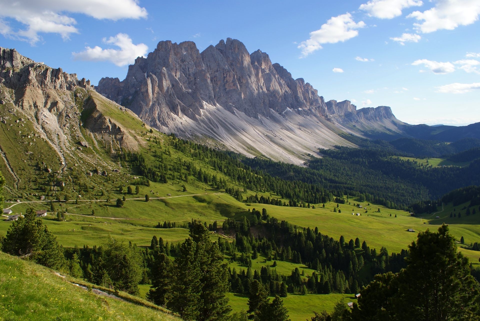 We gaan met de lijnbus naar de Zanseralm. We volgen het Adolf Munkelpad naar de Geisleralm en lopen onder langs de Geislergruppe/het Odle massief. Via de Düsslerhütte dalen we weer af naar de Zanseralm of naar St. Magdalena, alwaar we de bus terug nemen naar Teis.