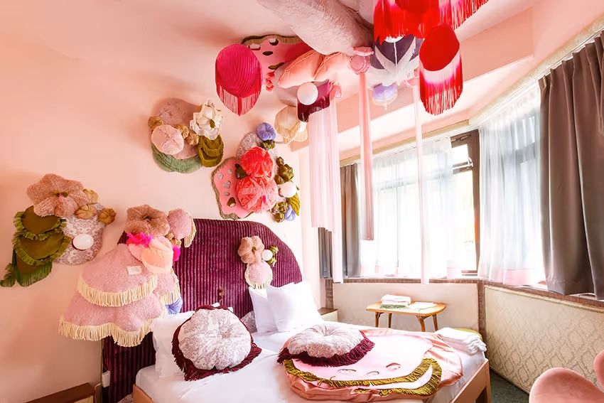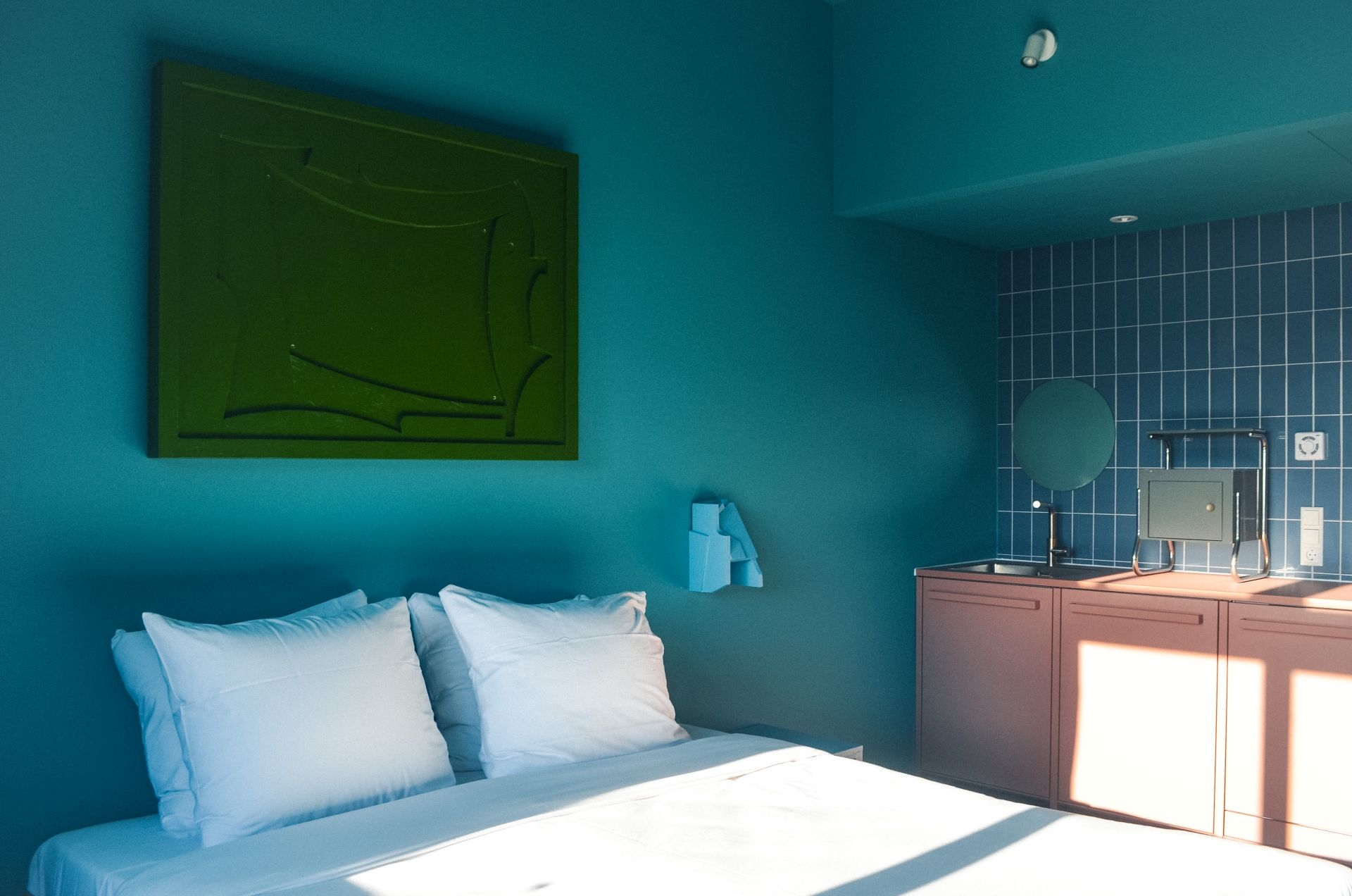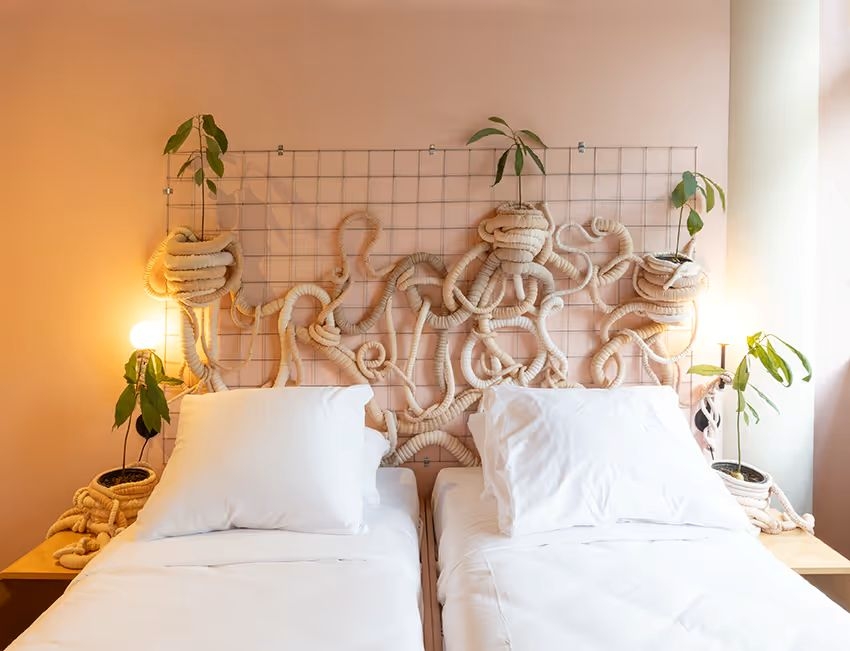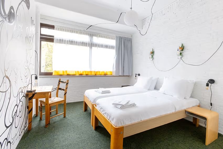 kamers: de Groene Afslag is geen dertien-in-een-dozijn hotel. Hier slaapt u tussen de kunst, onder verhalen en bovenop een berg idealen. De 30 hotelkamers zijn gemaakt door 30 verschillende kunstenaars. Allen kregen ze de opdracht: maak een kamer die laat zien dat afval niet bestaat of dat we de natuur weer centraal moeten stellen. Ze zijn dus allemaal anders, maar altijd met goede Auping bedden en met eigen badkamer en toilet.