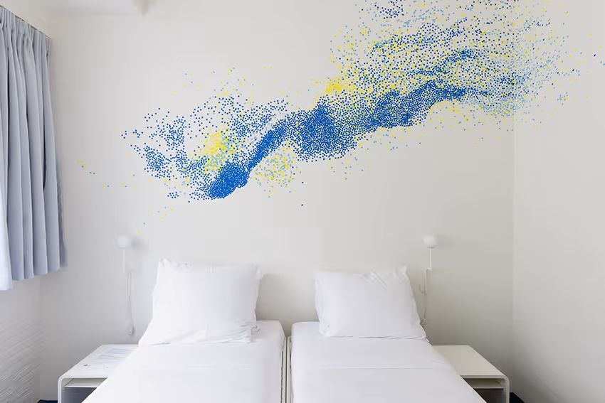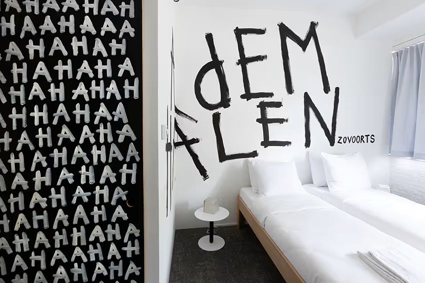 faciliteiten: het gebouw is een oud militair opleidingscomplex waar soldaten bommen leerden maken en demonteren. Dertig jaar geleden vertrok defensie van dit terrein en sindsdien stond de school leeg. Toen de huidige eigenaren het aantroffen, hadden de elementen, kwajongens en koperdieven er flink huisgehouden. De natuur had ware kunstwerkjes gerealiseerd: er zat nauwelijks nog een dak op het gebouw, er stond water in de kelder, het gros van de ramen was kapot en alle deuren waren zo krom als een hoepeltje. Maar het betonnen karkas - van militaire degelijkheid - stond nog altijd fier overeind. De huidige eigenaren wisten het meteen: dit wordt de plek waar wij munitie voor de grote ommezwaai naar een nieuwe economie gaan maken. Ook alle kunstwerken in de vide van het hotel voldoen aan dit adagium. Hier tref je de Waterval van Maarten Baas, een levensgrote haai van Vincent Mock en De Blauwe Stad van Carolien Adriaansche. Het hotel heeft een restaurant, bar, terras en een betaalde parkeerplaats.