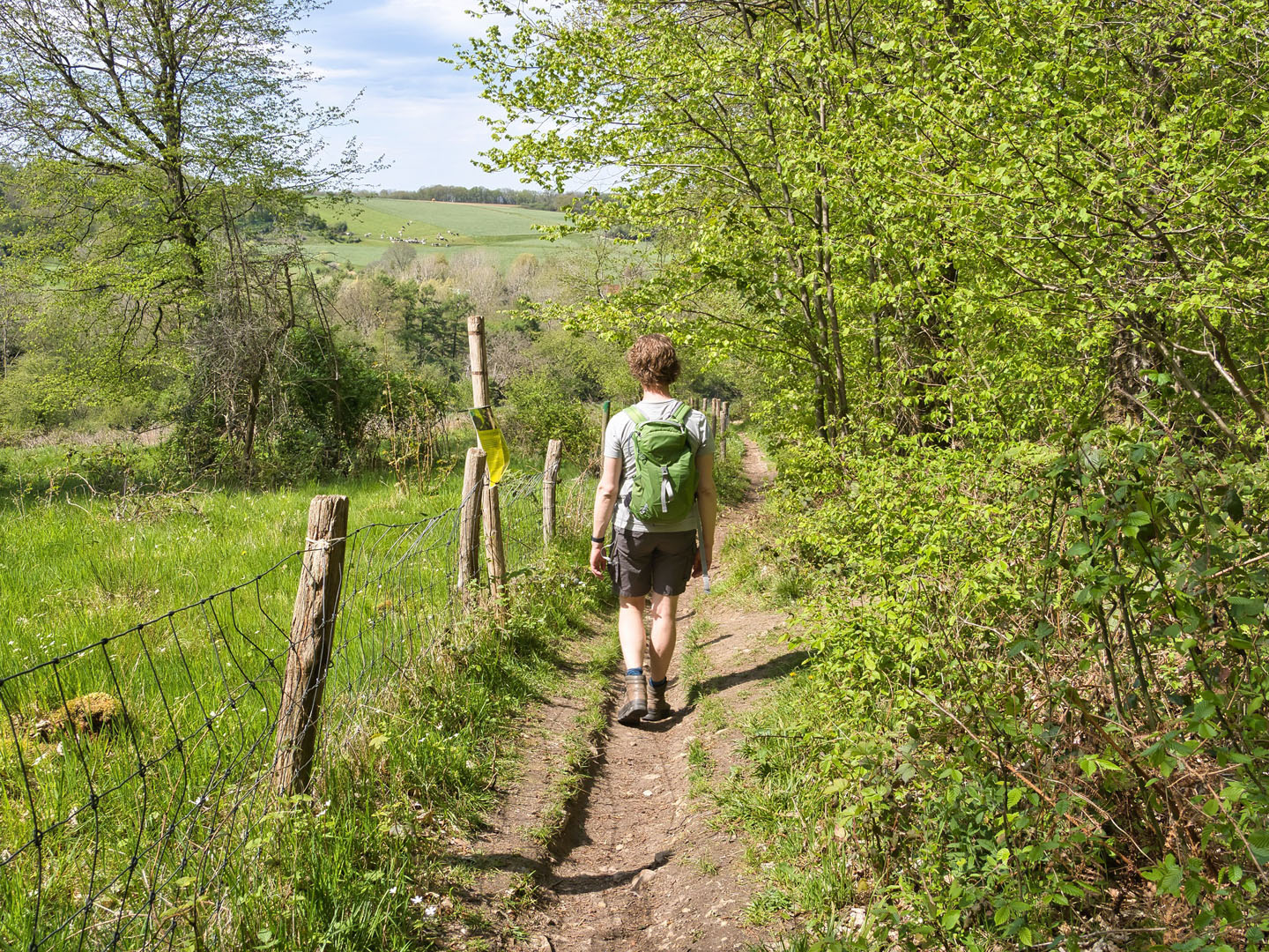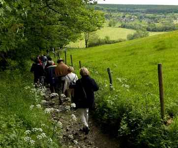 route: heuvels (max. ca. 200 m.; Mesch ligt op ca. 70 m.) afgewisseld met dalen van grotere en kleinere riviertjes. Per wandeldag wordt ca. 13,5-20 km (op de aankomstdag ca. 9 km) afgelegd.
