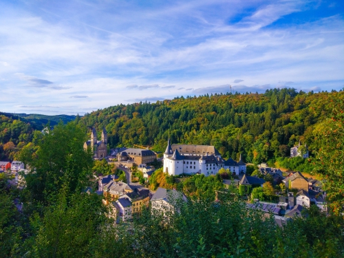 Elk Nederlands station-Clervaux per trein (richttijden vertrek Groningen 06.00 uur, Amsterdam 08.00 uur, Eindhoven 09.30 uur, Maastricht 10.30 uur, aankomst Clervaux 14.00 uur). Te voet naar het hotel (ca. 10 min.). Inchecken. We beginnen deze wandelvakantie in Luxemburg met een inleidende oriëntatiewandeling in de directe omgeving van Clervaux (lokale wandeling nummer CL2, ca. 7 km/2 uur). De route gaat o.a. door de dichte bossen van Jonkerbësch en naar de hooggelegen benedictijnse abdij Abbaye Saint Maurice. Het start- en eindpunt van de wandeling is tegenover het hotel.