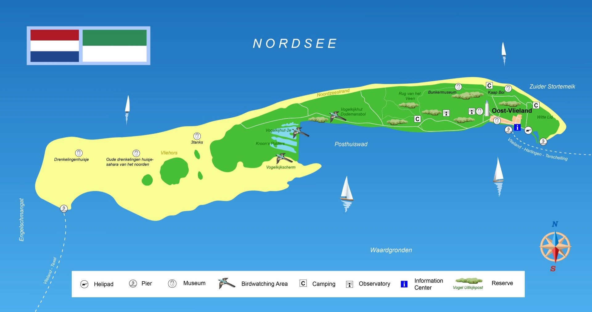 Na het ontbijt checken we uit bij ons hotel en laten we de bagage achter zodat die naar de veerhaven vervoerd kan worden. Zelf trekken we nog een laatste keer de wandelschoenen aan. We wandelen vanuit onze accommodatie naar de haven. Langs de ijsbaan, te herkennen aan de lantaarns aan de oever, gaat de tocht richting oostpunt. We lopen de laagte van de Oostervallei in. Deze duinvallei achter de zeereep is populair bij trekvogels als de tapuit en het paapje. Op het strand in de Noordoosthoek zullen we ons verbazen over de korte afstand tot de duinen van Terschelling. We volgen de ronding van het eiland over het strand. De veerboot vaart hier vlak langs de kust om de zandplaat Richel te ontwijken. Waar het strand ophoudt lopen we de havenkade op, waar we om 15.35 uur de sneldienst terug nemen naar het vasteland. Een latere boot nemen of op eigen gelegenheid nog een paar dagen langer op Vlieland blijven kan natuurlijk ook.