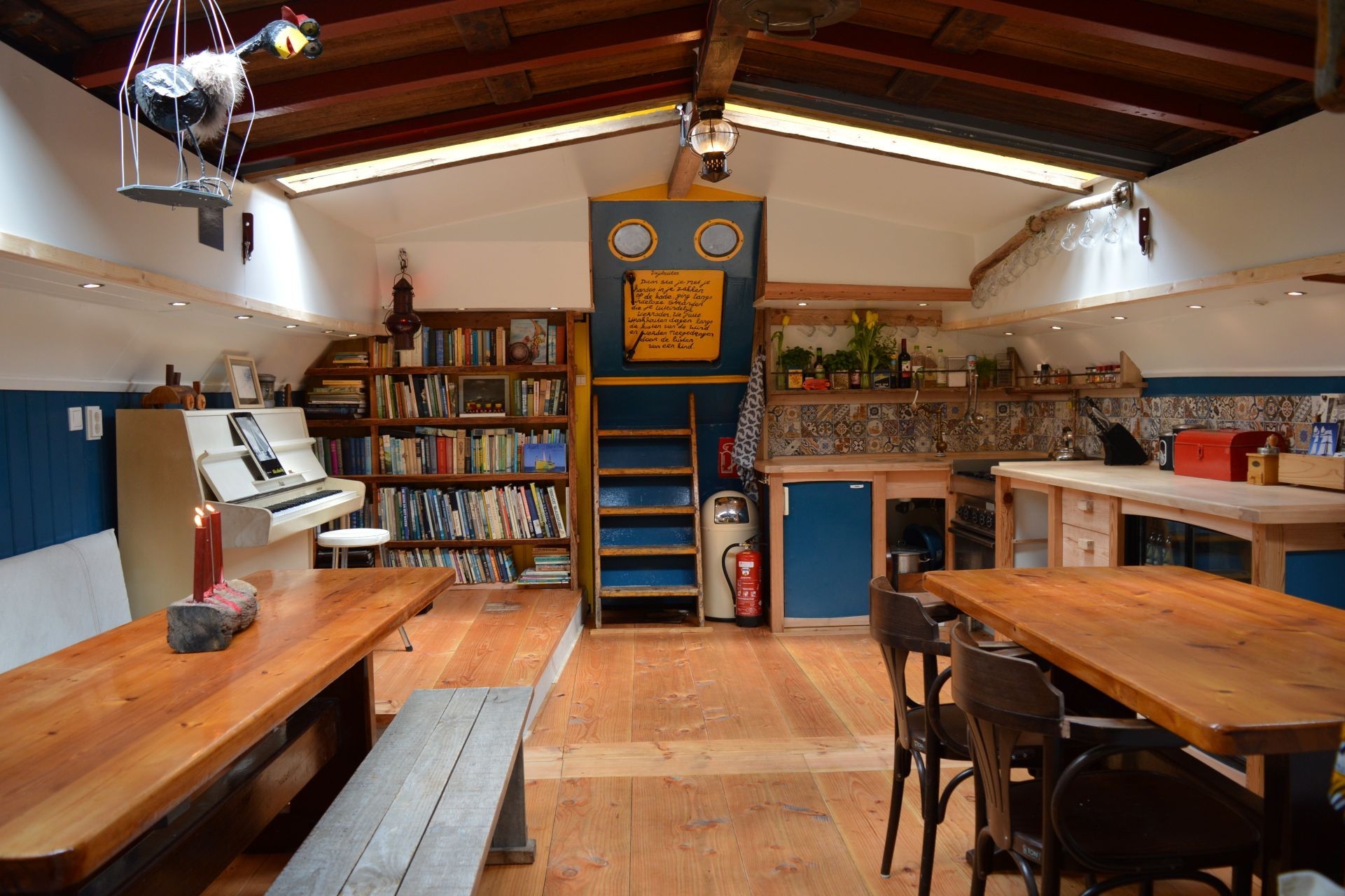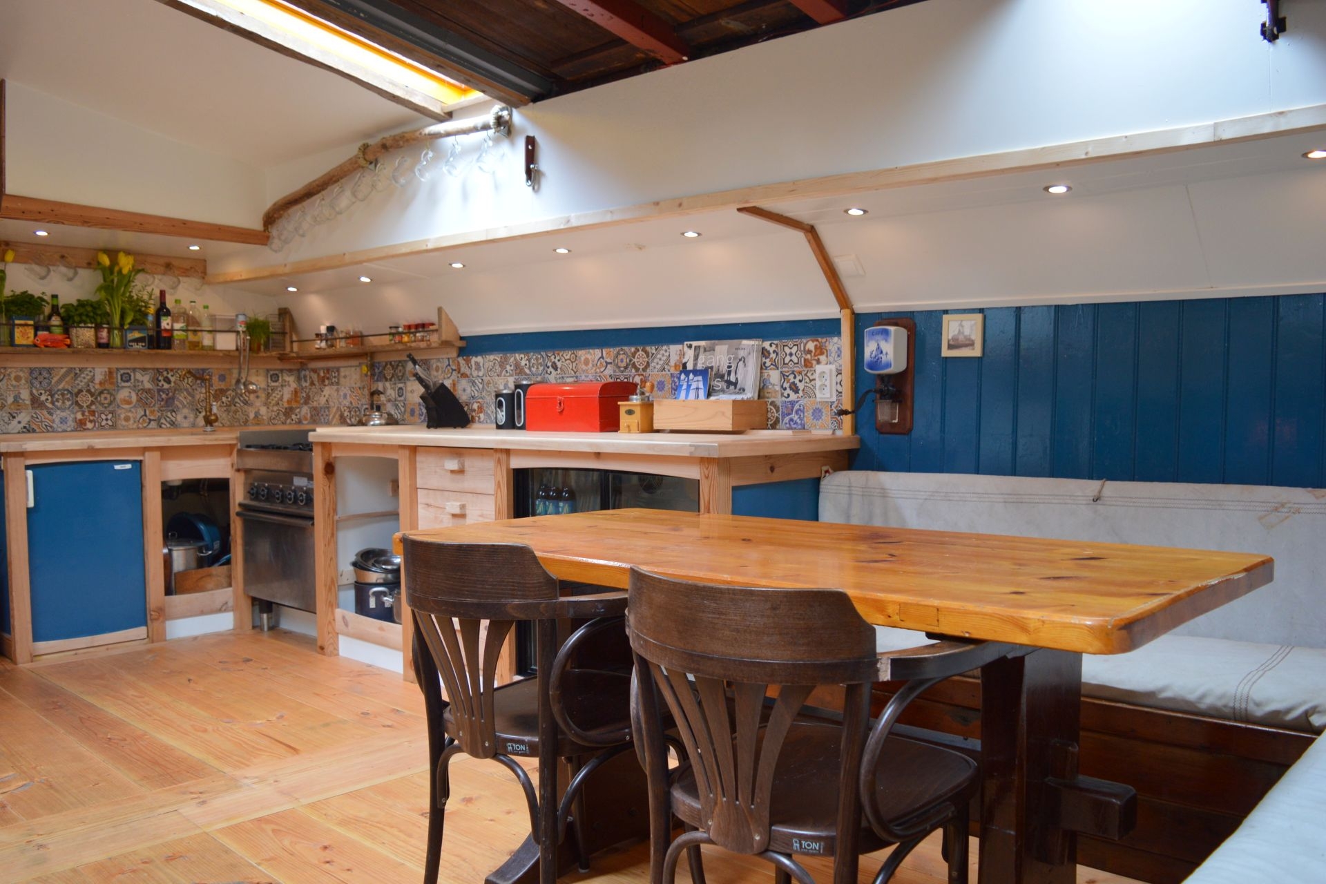 Binnen voelt Vrijbuiter als een huiskamer op zee. Na een verbouwing in 2020/2021 ontstond een ruim en sfeervol leefruim met open keuken, eigenwijs ingericht en met oog voor detail. Benedendeks is het gezellig samen zitten, luisteren naar elkaars verhalen, een boek lezen of een spelletje doen. Luxe hutten zijn er niet, maar de kooien slapen prima – passend bij de filosofie van terug naar de basis.