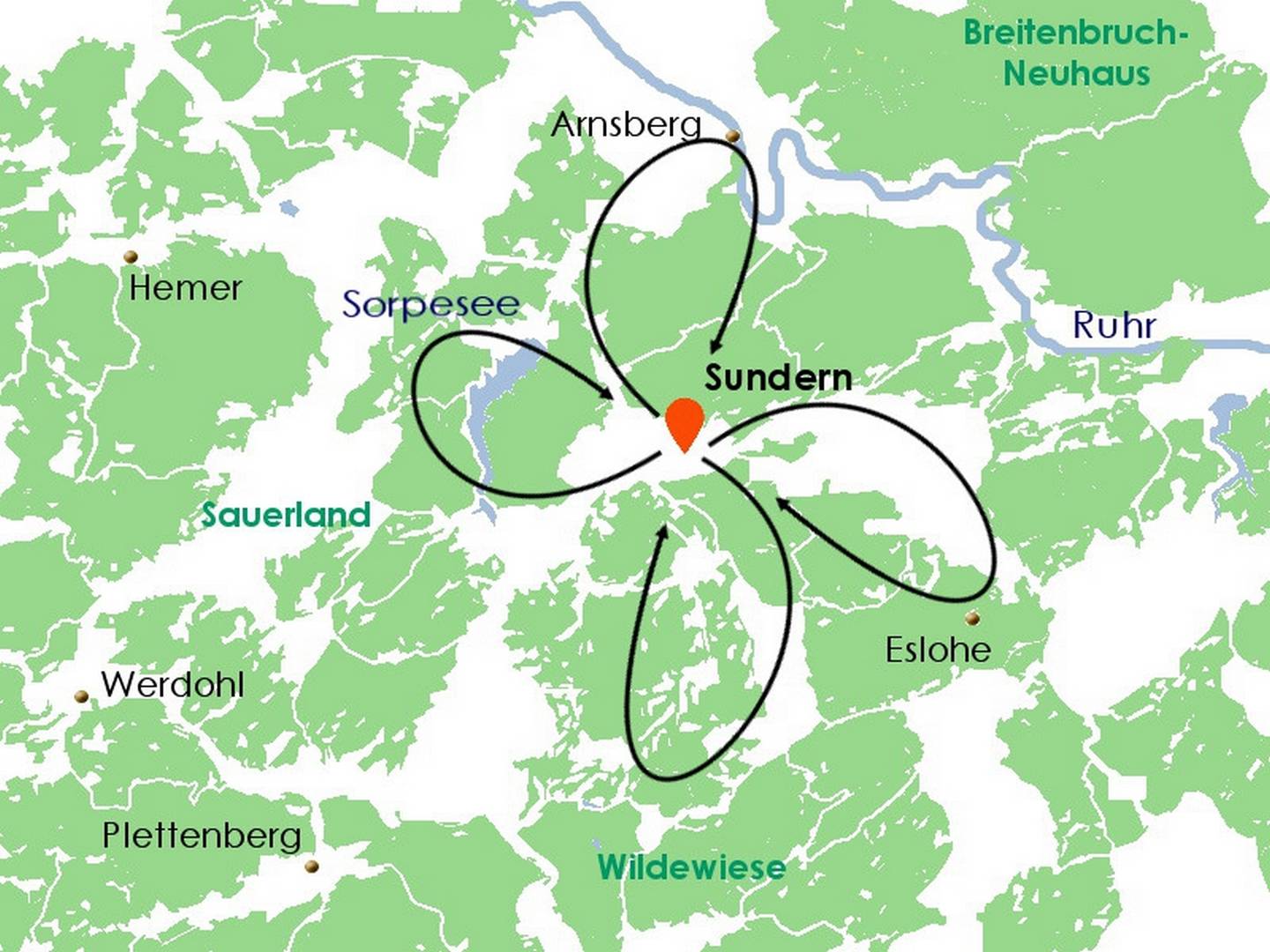 We stippelden twee routes uit aan de hand van de Sauerland Waldroute. Dit lange afstandspad is maar liefst 240 km lang en loopt van Iserlohn, via Marsberg naar Warstein. Tijdens de wandelingen maakt u kennis met de unieke flora en fauna van deze streek, maar ook met de legendes en sagen van het Sauerland. Een natuurrijke én belevenisvolle wandelroute dus. Een van de routes loopt vanuit Sundern naar Arnsberg. Al snel na de start van de wandeling wordt u opgeslokt door de dichte bossen van natuurpark Homert. Deze middelzware tocht van ca. 20 km kent een klimmetje, maar daarna is het genieten van vergezichten en aan het einde een fijne afdaling. De wandeltocht eindigt in de aan de Ruhr gelegen stad Arnsberg. In het centrum lijkt de tijd stil te hebben gestaan dankzij de sfeervolle, betimmerde huizen. Een ander middeleeuws hoogtepunt (letterlijk en figuurlijk) is de burcht van Arnsberg. U reist vanuit Arnsberg gemakkelijk met de lijndienstbus terug naar het hotel in Sundern.