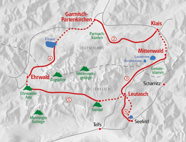 Tijdens deze wandelvakantie passeert u bekende dorpen als Garmisch (van het schansskiën), Mittenwald, Leutasch en Seefeld. U wandelt door een afwisselend landschap van bos en open terrein over lieflijke almen, door indrukwekkende kloven en langs kristalheldere bergmeertjes.