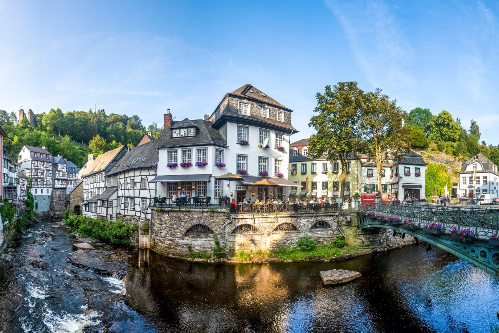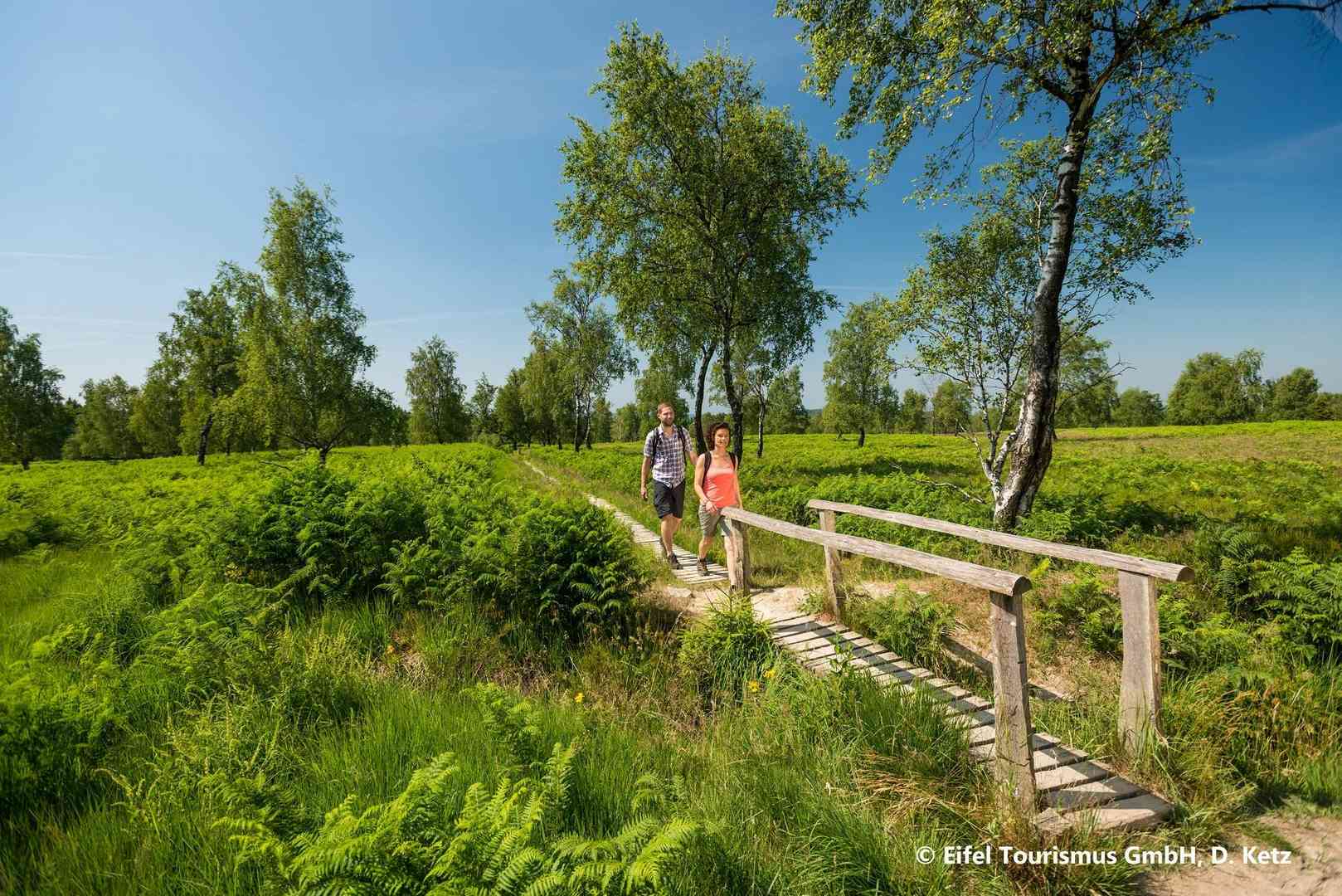 Meteen aan het begin van deze etappe loopt u een spannend grensgebied binnen en steekt in Roetgen het tracé over van de oude Vennbahn, die bij België hoort. Daarachter bent u weer in Duitsland. Beter gezegd in een Duitse exclave - want dit deel van Roetgen wordt helemaal omgeven door België. U passeert de overblijfselen van de Reinartzhof, over de geschiedenis hiervan hoort u onderweg het een en ander. Daarna via een lange rechte weg door de geheimzinnige Hoge Venen. Een beloning staat aan het einde van dit routedeel te wachten: u bereikt op 658 meter het hoogste punt van de Eifelsteig! Het is het Eifel-uitzichtpunt ’Steling’, dat u een ver uitzicht over de Eifel biedt. Nu heeft u echt wel een pauze verdiend! Bij Keizer-Karels-bed kunt u ’keizerlijk’ uitrusten op een grote steen. Vervolgens gaat u verder naar het doel van deze Eifelsteig-etappe: de lakenweversstad Monschau. U wordt ontvangen door romantische vakwerkhuizen in het historische stadsgedeelte. U treft er volop kleine cafés en restaurants. Een specialiteit zijn de ’Monschauer Dütchen’ - echt iets voor zoetekauwen!