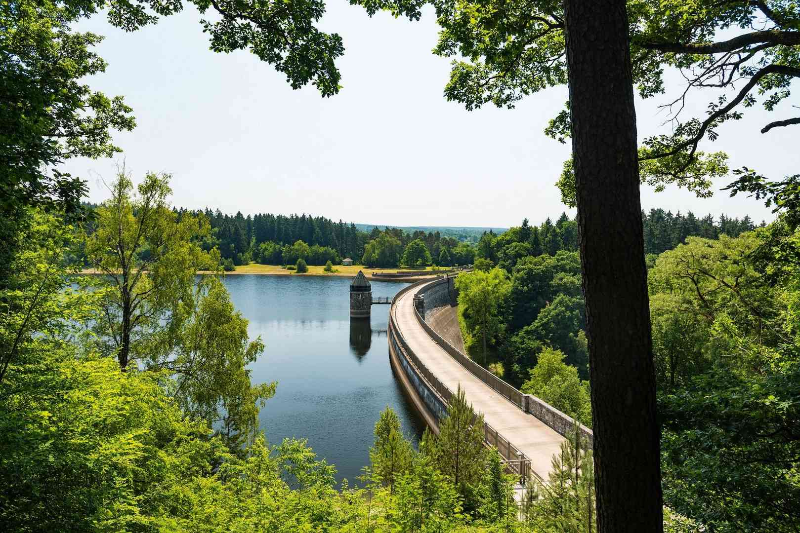Vandaag start u in Einruhr, dat u eerst licht bergopwaarts in een grote boog omcirkelt. Het water van de Obersee wijst u de weg, tot u zelfs heel dicht langs de steile rotsoever wandelt. U komt bij de Urftstuwdam. Een imposant en solide historisch bouwwerk en een van de oudste stuwdammen in Duitsland. Slenter over de muur en geniet van het uitzicht over het rustgevende water en het groen van het bos. Hier heeft u ook de gelegenheid voor wat bezinning. De pauze doet u goed, want nu slingert u bergopwaarts en wordt u beloond met een panorama over stuwdam en meren. Niet te geloven, maar helemaal boven aangekomen bevindt u zich midden in een open landschap. Het is de Dreiborner Hoogvlakte. U wandelt verder, langs de verlaten plaats Wollseifen en u ontdekt aan de horizon een solide hoge toren. Hij hoort bij de voormalige NS-Ordensburg Vogelsang. Het gebouwencomplex boezemt respect in en is tegenwoordig een internationale plaats voor tolerantie en diversiteit. Op het terrein bevindt zich ook het Nationale Park-centrum en een tentoonstelling over de geschiedenis van Vogelsang. Een pauze is de moeite waard: u heeft een uniek uitzicht over het Urftmeer en de Dreiborner Hoogvlakte. Na de pauze bergafwaarts naar het dal van de Urft, in de richting van het doel van de etappe Gemünd.
