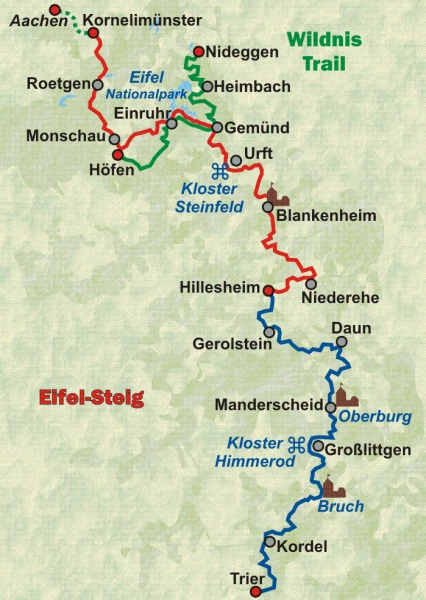 De totale Eifelsteig met 15 dagtrajecten is bij Aktiva Tours opgebouwd in 3 verschillende individuele reizen: Eifelsteig Noord (8 dagen), Eifelsteig Midden (5 dagen) en Eifelsteig Zuid (9 dagen).