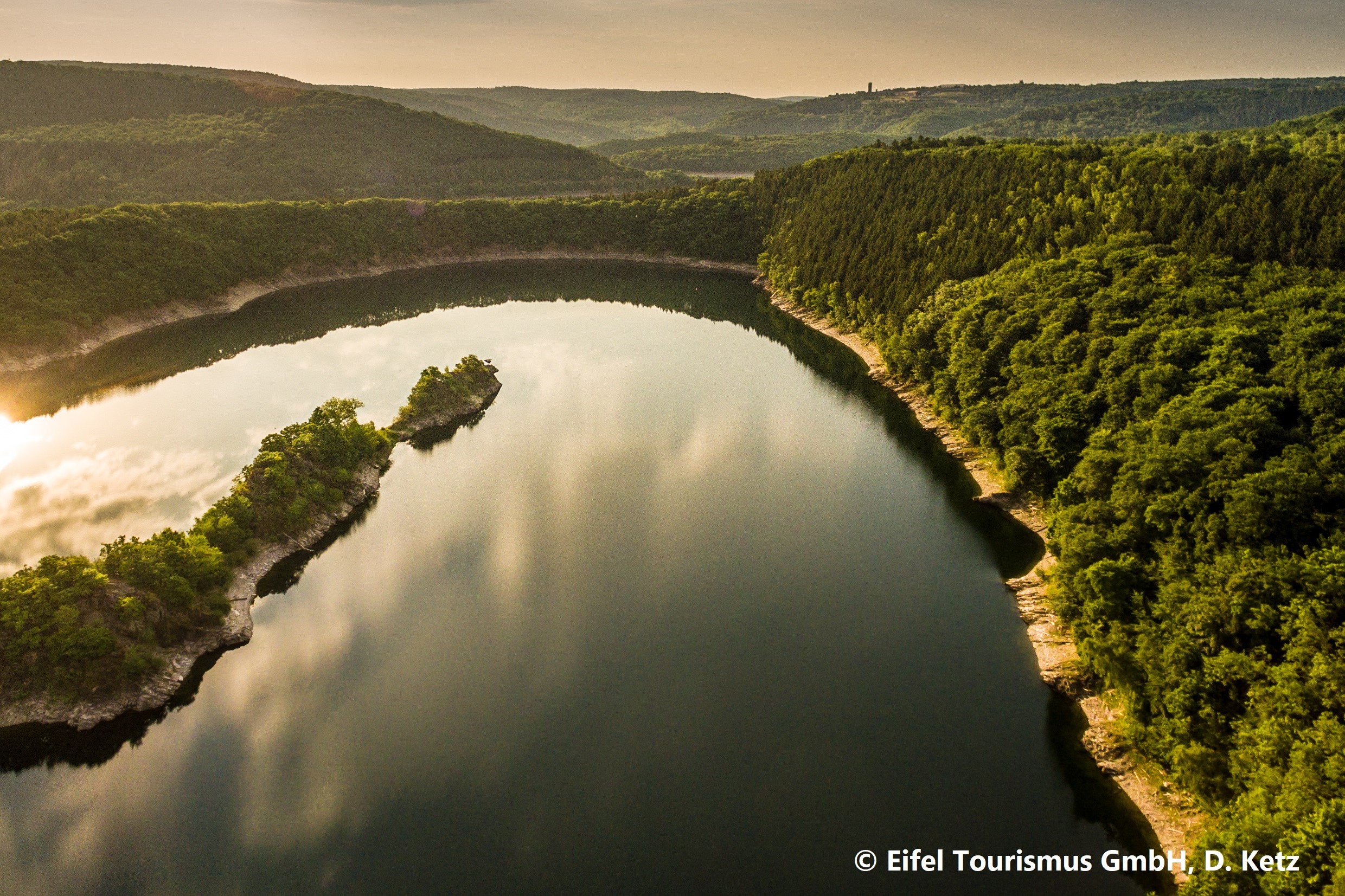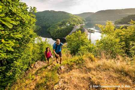In een gestaag op en af leidt de Eifelsteig u verder. Het uitzicht vanaf de Wolfsheuvel laat u uw doel zien: Einruhr.