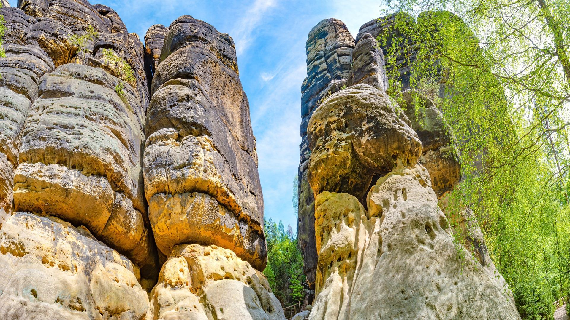Al wandelend over het Gratweg-pad door het Schrammstein-massief klimt u direct omhoog naar het Schrammstein-uitkijkpunt. Langs de Grote en Kleine Dom bereikt u het Affensteinweg-pad, dat u rechtstreeks naar de Lichtenhain-waterval leidt. Na een bezoek aan de natuurlijke boog Kuhstall daalt u weer af in het Kirnitzschtal om het einde van de wandeltocht van vandaag te bereiken: Neumannmühle, een technologisch monument. Met de bus gaat u terug naar het Kirnitzschtal of Bad Schandau.