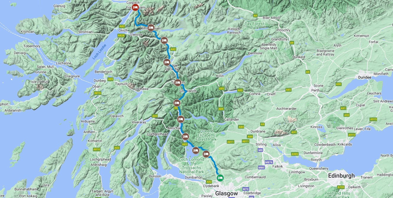 * Noot: Als u van verder weg reist, raden wij sterk aan om een extra nacht vooraf in Milngavie of Glasgow aan uw reis toe te voegen. Zo heeft u de kans om te ontspannen en van een rustige avond te genieten voordat uw avontuur over de West Highland Way de volgende ochtend begint. U kunt een voorovernachting boeken zodra u uw reisdata heeft gekozen. Omdat Milngavie slechts 25 minuten met de trein van Glasgow verwijderd is, is het een uitstekende optie voor wie eerst Schotlands grootste stad wil verkennen voordat de wandelroute begint. Wanneer u géén voorovernachting in Milngavie bijboekt moet u er rekening mee houden dat u de bagage tussen 08:30 en 09:00 uur moet inleveren.